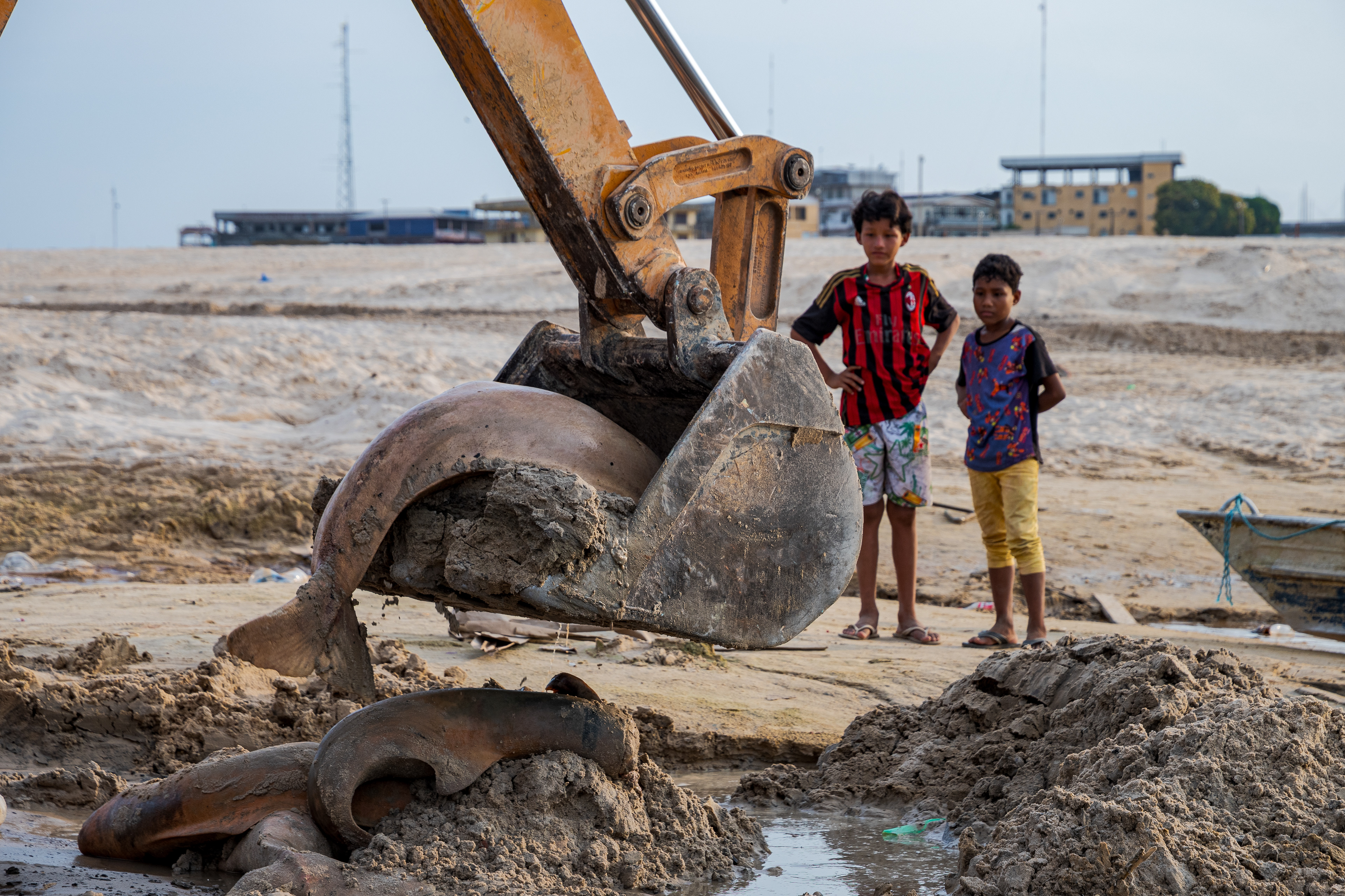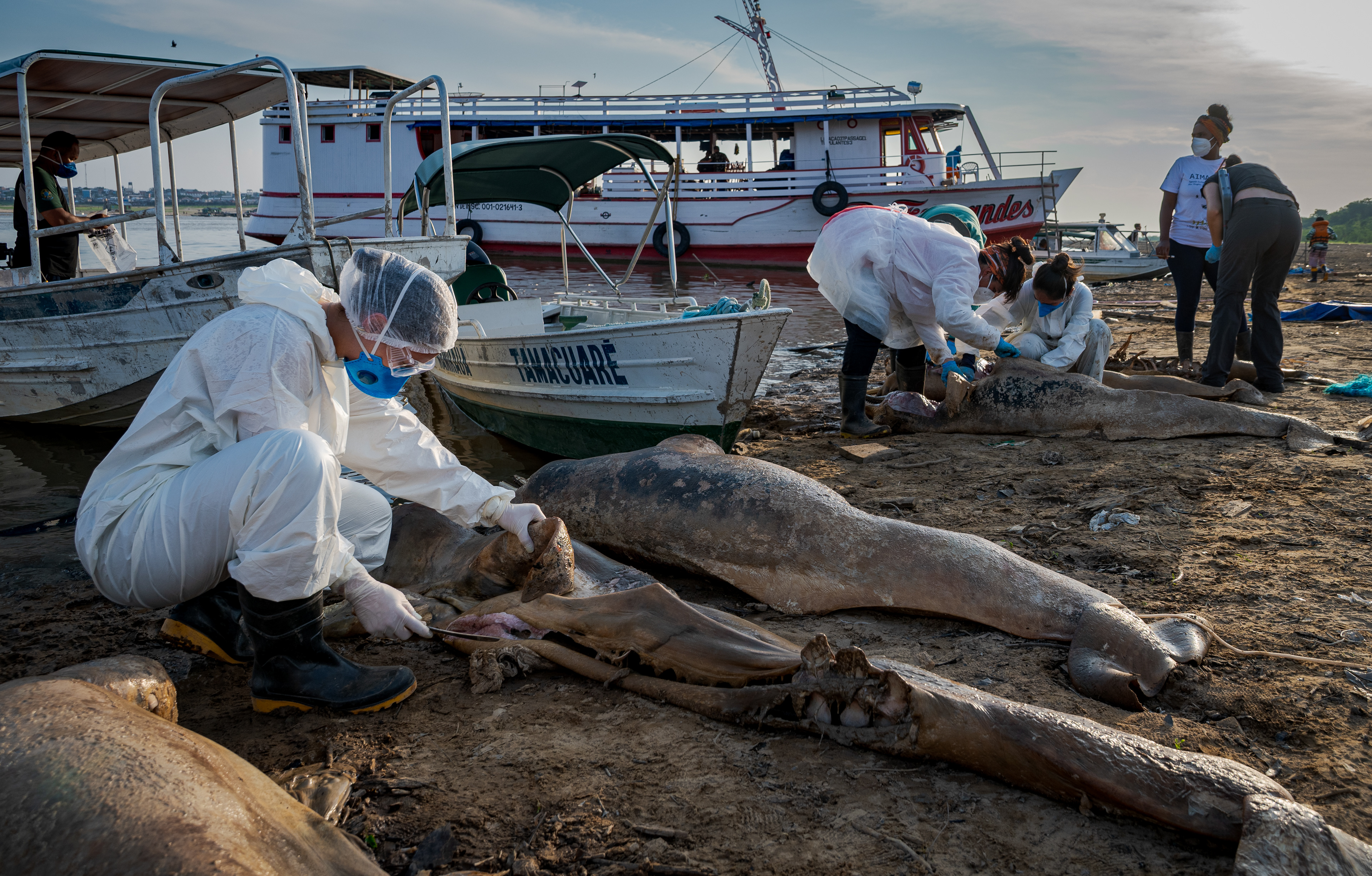 Local children watch in awe as the once plentiful and playful dolphins are hauled away to be buried on a mass grave. Such an event had never been seen anywhere in the world.